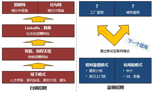 通過分析整個招聘行業(yè),我們看到白領(lǐng)招聘已經(jīng)互聯(lián)網(wǎng)化并進(jìn)入細(xì)分競爭階段。由于智能手機(jī)的普及,藍(lán)領(lǐng)招聘剛剛進(jìn)入移動互聯(lián)網(wǎng)化的窗口期,尚未有成型的玩家出現(xiàn)。信息源:揭陽人才網(wǎng)_www.www.xhcaiwa.com